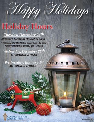Community First Bank & Trust Locations: MAIN OFFICE 10:00 am - 3:00 pm 501 South James Campbell Blvd. Columbia, TN 38401 DOWNTOWN 10:00 am - 2:00 pm 601 North Garden Street Columbia, TN 38401 COLUMBIA WAL-MART 2:00 pm - 4:00 pm 2200 Brookmeade Dr. Columbia, TN 38401 MT. PLEASANT 2:00 pm - 4:00 pm 105 Public Square Mt. Pleasant, TN 38474