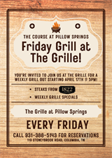 Friday Grill at The Grille! We'll be grilling steaks from Maury County's own, 1822 Farms. Call 931-388-5143 to make reservations.