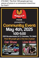 Hello! My name is Kevin Scott with Marco's Pizza in Columbia, Tennessee. We are having a community event to let everyone know where we are located and to show our respect to POLICE OFFICERS, FIREFIGHTERS, EMTS, MILITARY, AND VET'S!! Please come out and have a great time!! Sunday May 4th. 1:00 to 5:00 PM.